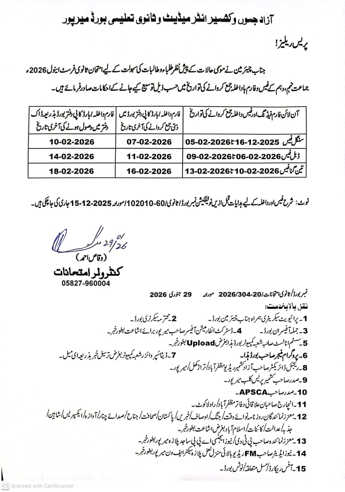 AJK Mirpur board date sheet 2026 ssc